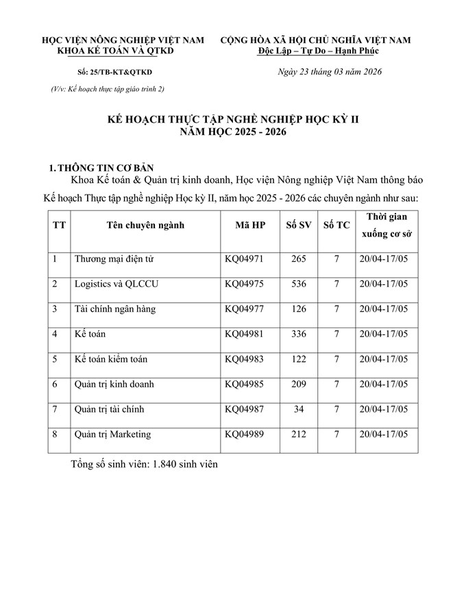 Khoa Kế toán và Quản trị kinh doanh thông báo Kế hoạch thực tập nghề nghiệp học kỳ II năm học 2025 - 2026