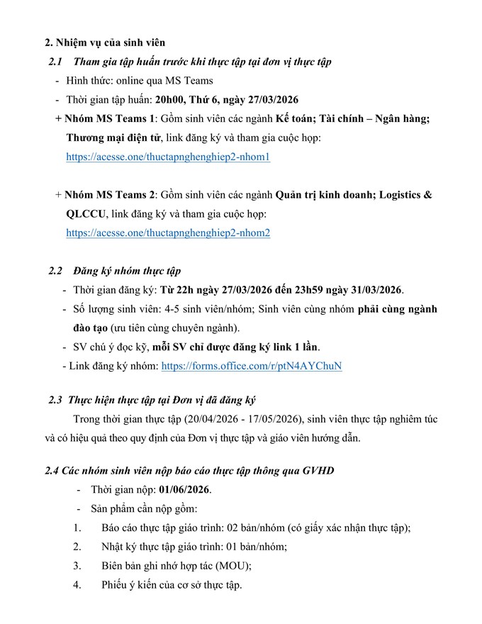 Khoa Kế toán và Quản trị kinh doanh thông báo Kế hoạch thực tập nghề nghiệp học kỳ II năm học 2025 - 2026 và đường link các Em tham gia nhóm
