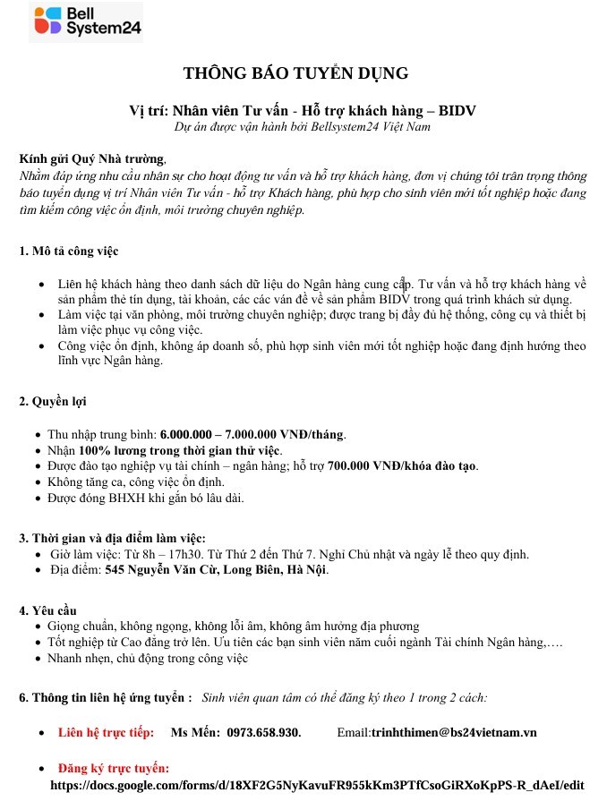 Tuyển dụng vị trí: Nhân viên Tư vấn - Hỗ trợ khách hàng – BIDV