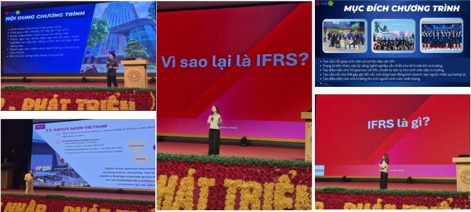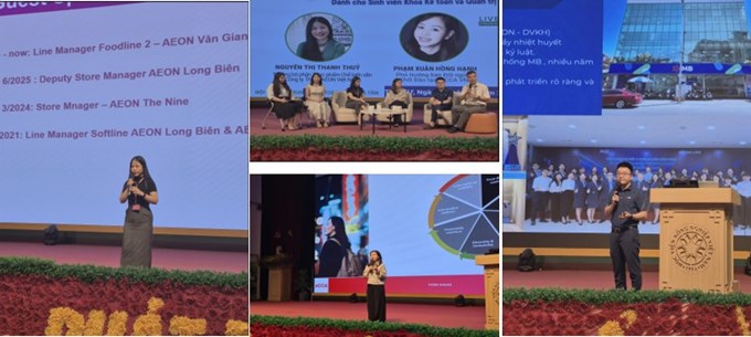 Tứ phía doanh nghiệp, các diễn giả đến từ Công ty cổ phần quốc tế Long Hưng -chị Đặng Thị Kiều Anh, giám đốc công ty; Công ty TNHH Aeon Việt Nam- chị Nguyễn Thị Thanh Thuỷ, trưởng bộ phận Thực phẩm chế biến sẵn; Ngân hàng MB bank– anh Trần Ngọc Vinh, phó giám đốc khối KHCN, chi nhánh Gia Lâm, đã có bài trình bày riêng theo từng chủ đề lĩnh vực hoạt động của doanh nghiệp cũng như về cơ hội tuyển dụng và ưu đãi dành riêng cho sinh viên các ngành thuộc Khoa Kế toán và Quản trị kinh doanh nói chung và sinh viên các ngành Kế toán, Quản trị kinh doanh và Thương mại điện tử nói riêng.