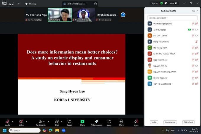 Ngày 27 tháng 10 năm 2025, nhóm nghiên cứu mạnh Kinh doanh, Thương mại và Phát triển bền vững, Khoa Kế toán và Quản trị kinh doanh đã mời GS.TS. Sang-Hyeon Lee – Giảng viên Khoa Kinh tế nguồn lực và Thực phẩm, Trường Đại học Hàn Quốc, Hàn Quốc trình bày nghiên cứu với chủ đề “Cung cấp nhiều thông tin sẽ có sự lựa chọn tốt hơn? Nghiên cứu thành phần dinh dưỡng và hành vi người tiêu dùng tại các nhà hàng - Does more information mean better choices? A study on calorie display and consumer behavior in restaurants”. Mục đích của seminar là thúc đẩy hợp tác, trao đổi nghiên cứu về hành vi và quyết định tiêu dùng thực phẩm giữa các giảng viên của Học viện Nông nghiệp Việt Nam và Trường Đại học Hàn Quốc. Seminar có sự tham dự của các cán bộ, giảng viên và sinh viên Khoa Kế toán và Quản trị kinh doanh và Khoa Tài nguyên và Môi trường, Học viện Nông nghiệp Việt Nam. Đồng thời, seminar có sự tham dự của PGS.TS. Ryohei Kageura – Phó Giám đốc Trung tâm nghiên cứu bền vững, Trường Đại học Thương mại Chiba, Nhật Bản. Seminar được tổ chức online qua ứng dụng Zoom.