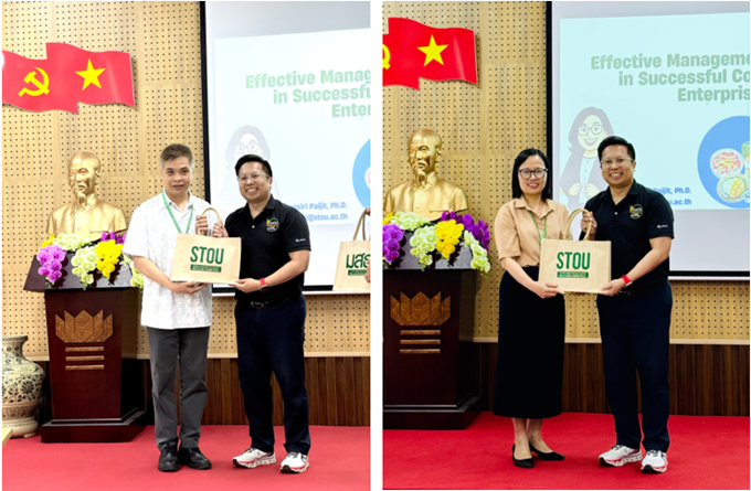 Buổi trao đổi học thuật có sự tham gia của đoàn 8 chuyên gia cấp cao đến từ Khoa Nông nghiệp và Hợp tác xã, Trường Đại học Mở Sukhothai Thammathirat (STOU), Thái Lan. Dẫn đầu đoàn là PGS. Janenarong Tiensawang, Trưởng khoa, cùng các giáo sư và tiến sĩ giàu kinh nghiệm trong lĩnh vực kinh tế cộng đồng.