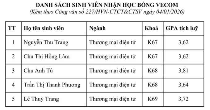 Ngày 9/3/2026, trong khuôn khổ hợp tác giữa Học viện nông nghiệp Việt Nam và Hiệp hội Thương mại điện tử Việt nam (VECOM), Khoa Kế toán và Quản trị kinh doanh - Học viện Nông nghiệp Việt nam đã phối hợp với VECOM đồng tổ chức lễ trao học bổng “Chắp cánh tương lai” cho sinh viên ngành Thương mại điện tử thuộc khoa. Lễ trao học bổng thuộc dự án “ Trao học bổng cho 15 trường đại học là thành viên của Hiệp hội Thương mại điện tử Việt Nam (VECOM) năm 2026” do VECOM phát động.