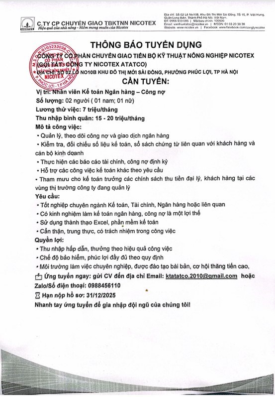 Công ty Cổ phần chuyển giao tiến bộ kỹ thuật nông nghiệp NICOTEX cần tuyển dụng